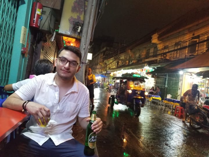 Then we had to cross the street. People cross the street there no problem; well we call it jaywalking in North America. My partner and I are from Syria and El Salvador respectively, so we felt like we got this, that's how we used to do it. We took a few steps onto the street and a scouter bike almost runs us over and then a tuktuk was honking at us until we returned to our side to safety. Guess we lost our touch. Then an old lady, with a cane and all, just started to walk across forcing cars to stop all around here. So we did what any reasonable person would do, we hid ourselves behind her in order to cross. You could say she was our Moses, opening the sea of cars so we could cross.