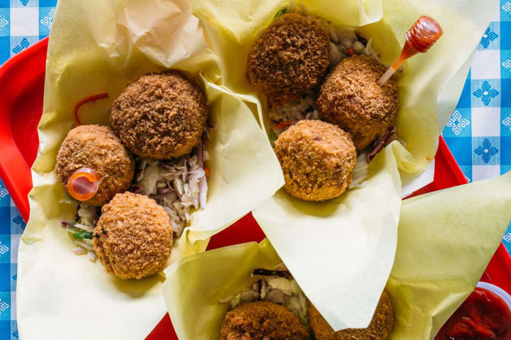 The State Fair of Texas is being held from September 30 - October 23, 2022, in Dallas, Texas. Fairgoers particularly enjoy the Injectable Great Balls of BBQ. To prepare them a smoked, shredded beef brisket is mixed with bock barbecue sauce laced with a German-style lager. Then the brisket is rolled in seasoned bread crumbs and deep-fried until golden and served on a bed of coleslaw. Each order comes with its own pipette of bock BBQ sauce to inject another blast of barbecue flavor.