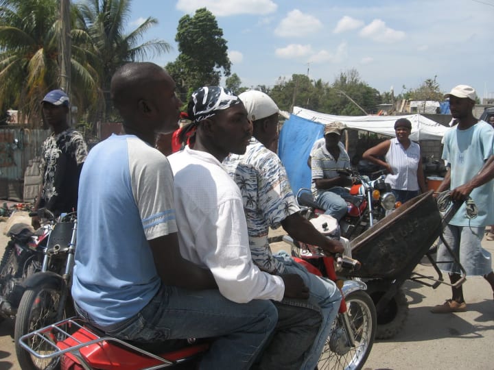 My Haitian friends definitely burst my little American comfort-bubble when they put me on a motorcycle, and I was sandwiched between two Haitians (both men) for a forty-five minute trek up and down the bumpy roadways. It looked a little bit like the following image (but imagine a skinny, white guy in the middle). This was a bit outside of my comfort zone (vast understatement), but hey, when in Haiti . . .