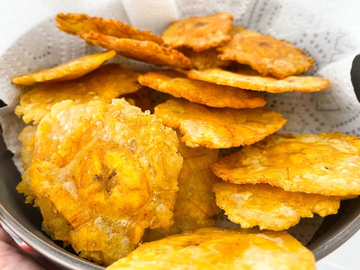 If you have managed to get your hands on a green plantain, then these are perfect for making patacones, which are twice-fried banana slices. Cut the plantain into large slices, at least 3-4 centimetres thick. You will then fry these in vegetable oil until they soften. Next, take a plate or chopping board and flatten the banana until it is about half a centimetre thick. Return these to your frypan and cook until crispy and golden. Sprinkle with salt to serve.