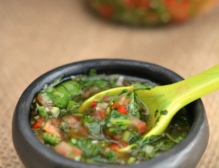 This salsa is also for serving. Finely chop about 3 shallots, 1 white onion, 3 tomatoes, a handful of coriander and a chilli. You can modify the amount of chilli depending on how spicy you would like the dish, though Colombian food is traditionally quite mild. To this, add 1 part olive oil to 1 part white vinegar.