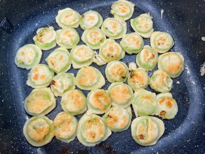 Heat a non-stick skillet over medium-low heat. Brush with the merest film of oil—too much would betray the dish’s essence. Carefully place battered luffa slices onto the warm surface. A soft sizzle arises as delicate golden lace forms at the edges. Patiently wait two minutes until the underside turns a luscious caramel hue. Flip gracefully with chopsticks, searing the other side to a crisp, sunlit gold. Behold: each piece emerges like a miniature harvest moon—edges crackling, while within lies a hidden reservoir of emerald-green summer freshness.