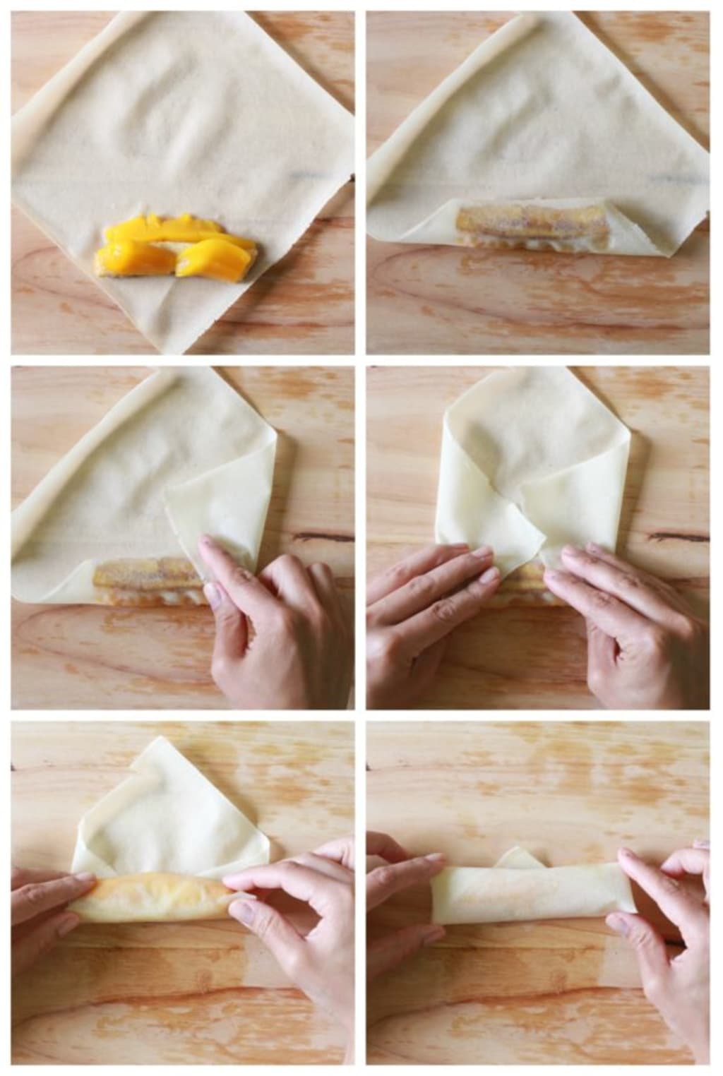 Fold the bottom point over the filling, then fold in the edges to create an envelope shape. Roll the wrapper toward the top point. Brush the top point with a bit of water and finish the roll to seal the end. Some like to use a beaten egg as a sealant but a splash of water will do the trick.