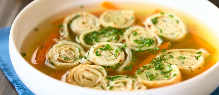 Fladlesuppe is a traditional Swabian soup that consists of rich broth with thin strips of fladle pancakes. These are German pancakes made with flour, eggs, milk or water, sugar, and salt. The soup is usually prepared with beef broth, but chicken or vegetable stock can also be used. The soup includes chunks of steamed or sauteed vegetables like leeks, carrots, celery, and green onions. The sliced and rolled strips of pancakes are placed into bowls and the hot soup is poured over them. The soup is topped with chopped parsley, chives, or celery leaves.
