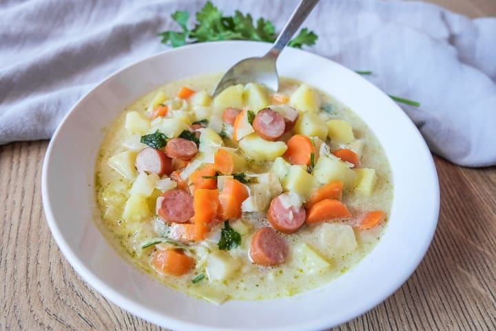 Biersuppe is a traditional soup that is prepared by combining light and dark beer. Other ingredients in the soup are meat broth, water, flour, egg yolks, milk, cream, butter, and stale bread. The soup is simmered until it becomes thick and creamy. It is seasoned with salt and pepper but can also include sugar, honey, and spices like cinnamon and caraway seeds.