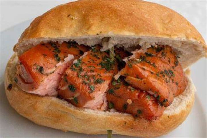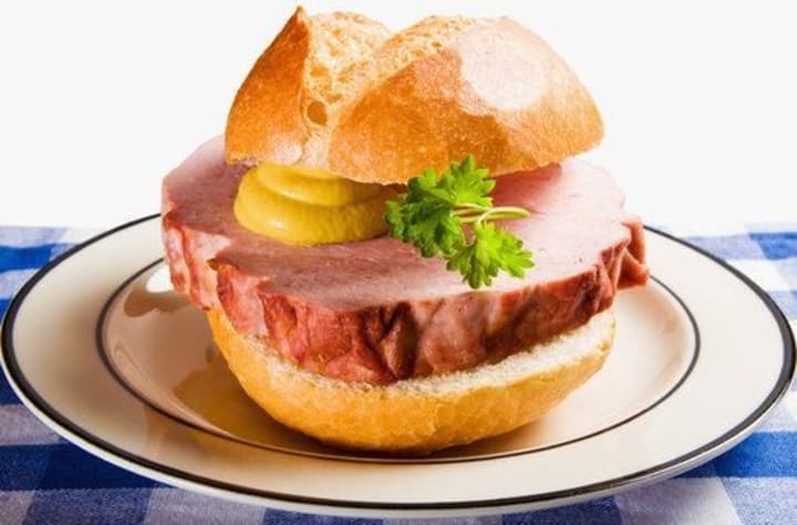 Leberkassemmel is a classic Bavarian and Austrian sandwich. It includes a thick slice of leberkase, which is ground meat that has been baked into a meatloaf. It is placed on half a bread roll along with mustard and pickles.
