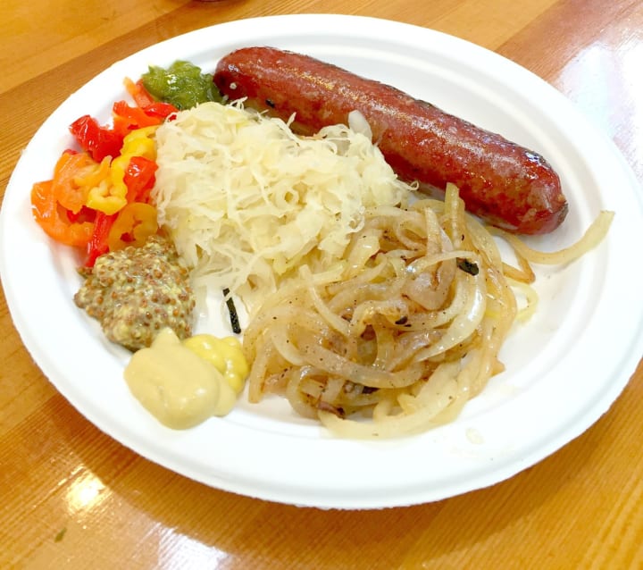 Knockwurst is a preboiled sausage made with ground pork, beef, or a combination of both. The sausage is heavily seasoned with garlic and the casing becomes extra crispy when heated. It is served with sauerkraut, potato salad, pickles, and mustard.