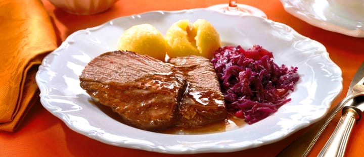 Sauerbraten is a traditional German pot roast. The beef is first marinated in red wine, tart vinegar, and spices. When ready for cooking, the liquid is whisked into a roux and simmered into a thick, brown gravy. This dish is usually served with spaetzle egg noodles, bread dumplings, or boiled potatoes, and braised red cabbage.