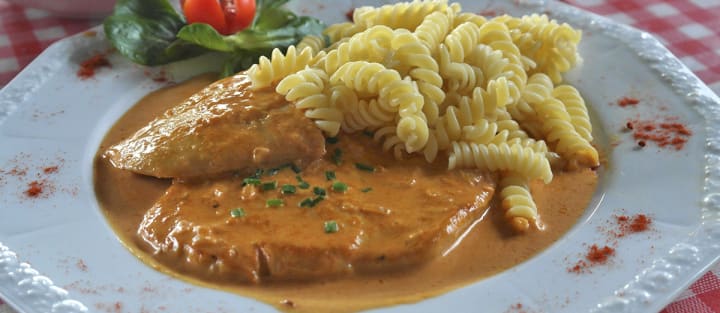 Rahmschnitzel is prepared with a veal cutlet, but pork or chicken can also be used. The meat is tenderized and seasoned, rolled in flour, and fried until golden brown. White wine is added to the pan to form a sauce with heavy cream and a bit of sugar. The dish is served with spaetzle or potatoes.