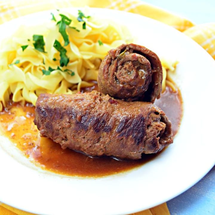 Rouladen are meat rolls filled with a variety of ingredients like thin strips of bacon and sliced pickles. Long thin beef steaks are pounded, seasoned, and layered with hot German mustard. Then rolled around the other ingredients and secured with toothpicks. The rolls are placed in a pot with water and simmered until the meat is tender.