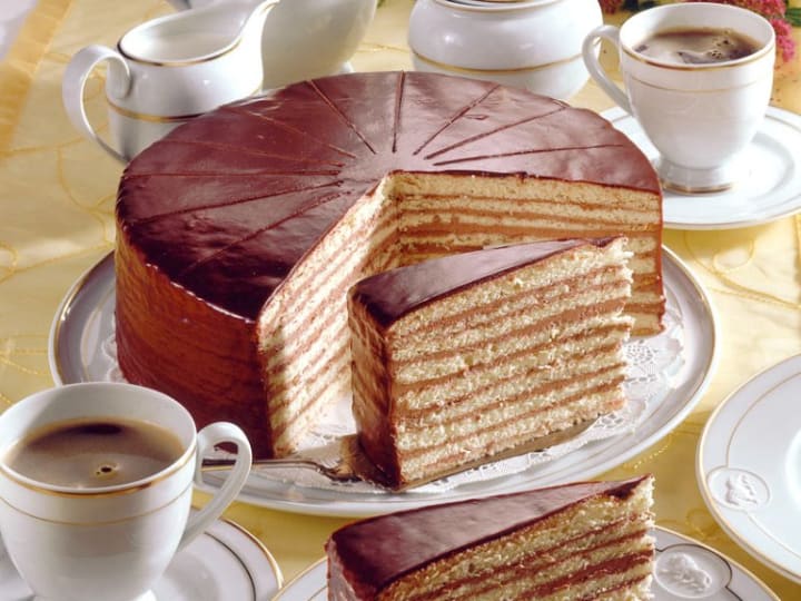 Prinzregententorte is a smooth, layer cake covered in chocolate with a chocolate buttercream filling. The cake consists of thin cake layers covered with chocolate buttercream, then stacked together and covered with a chocolate coating. The layers can also include apricot or raspberry preserves. The cake featured eight layers representing the eight districts of Bavaria, and today there are only seven districts, so the cake has seven layers.