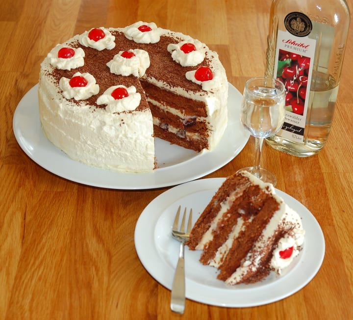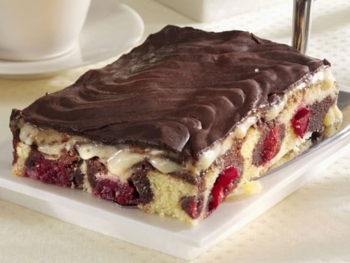 Donauwelle is a German and Austrian sheet cake. The cake consists of two pound cakes, one on the bottom flavored with vanilla, and one on top flavored with chocolate. It is decorated with cherries, buttercream, and chocolate ganache. As the cake bakes the tart cherries fall down into the batter making an interesting pattern.