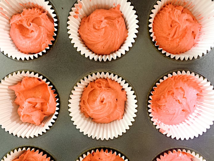 - Add in the flour and the pink food colouring, making sure the food colouring is well divided over the mixture and has not just clumped up somewhere. Especially if you are using a strong pigment, make sure it is divided up well and mixed in to the batter properly.