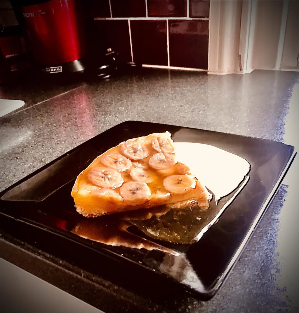 Ok, here we go...Preheat the oven to 200° C (400°F Gas mark 6) Heat the Vegan block butter and Golden syrup in a saucepan until the butter has melted and the mixture creamy smooth. Treat yourself to a deep inhalation of that delicious aroma. Just Yum. Boil for one minute. Pour directly into a tart dish or tin. Arrange the sliced bananas on top of the syrup, place on a baking tray and pop it into the pre heated oven for 10 minutes.