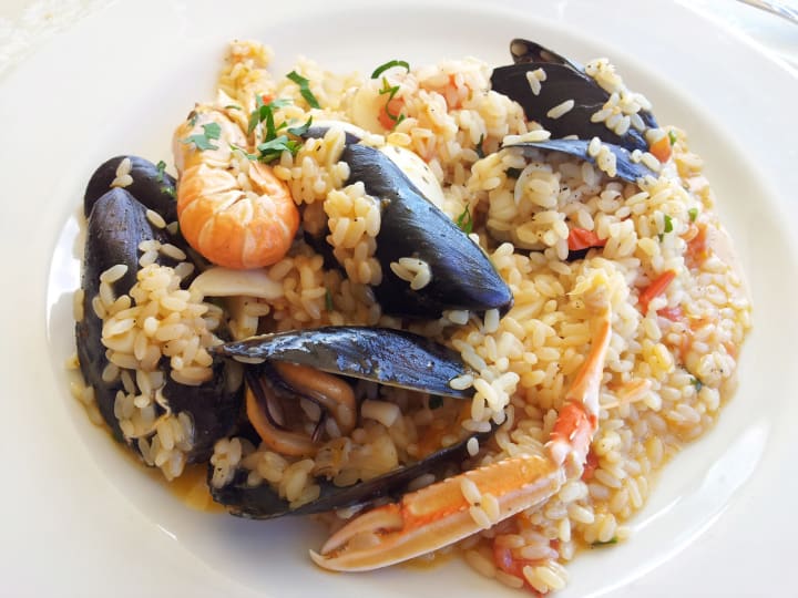 Risotto ai frutti di mare is a classic Italian rice dish. It includes clams, shrimp, lobster meat, squid, and mussels. Other ingredients are short-grain rice, butter, garlic, onions, white wine, parsley, and fish or vegetable stock. Occasionally it is enriched with saffron or tomato-based sauces.