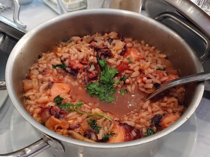 Arroz de polvo is a dish that is a combination of cooked diced octopus and rice. It is cooked in a rich base of tomatoes, sauteed onions, garlic, and spices. When done it looks like a thick rice stew.