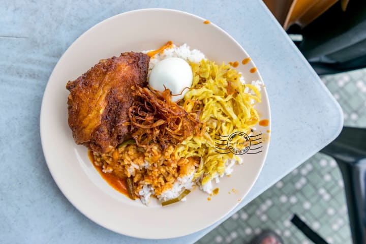 Nasi kandar is a classic dish combining steamed rice with an assortment of different curries, sides, and condiments. It originated in Penang. It is traditionally enjoyed as breakfast food.