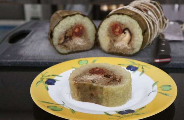 Banh tet is a specialty in South Vietnam. It is a sticky rice cake that can be either savory or sweet. It is made with glutinous rice stuffed with a mung bean or pork filling and wrapped in a banana leaf. Once wrapped it is boiled or steamed. When done the banana leaf is removed and the log-shaped cake is sliced into cylindrical pieces.