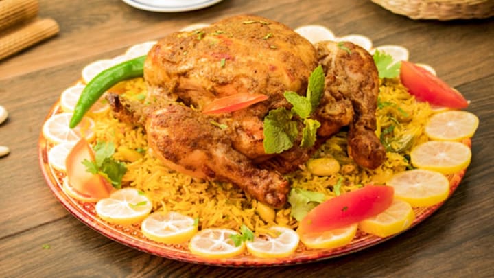 Madfoon is a signature Arabian dish. It includes meat and rice. The meat is marinated and cooked in an underground hole placed on sand and surrounded by charcoal, The meat is cooked slowly until tender. It is then served with rice.