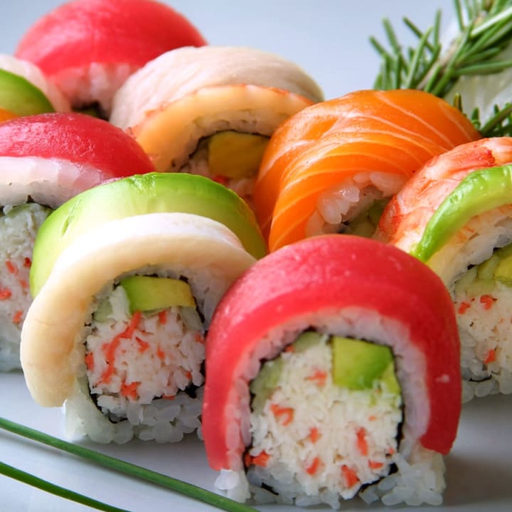 Rainbow rolls originated in Los Angeles, California. It is a type of uramaki or upside-down suchi. The rice is on the outside, wrapped around nori seaweed with ingredients like tuna, salmon, avocado, and cucumber. After the uramaki has been assembled the fish and avocado slices are arranged on top of the roll. Once the roll is ready it resembles a rainbow.