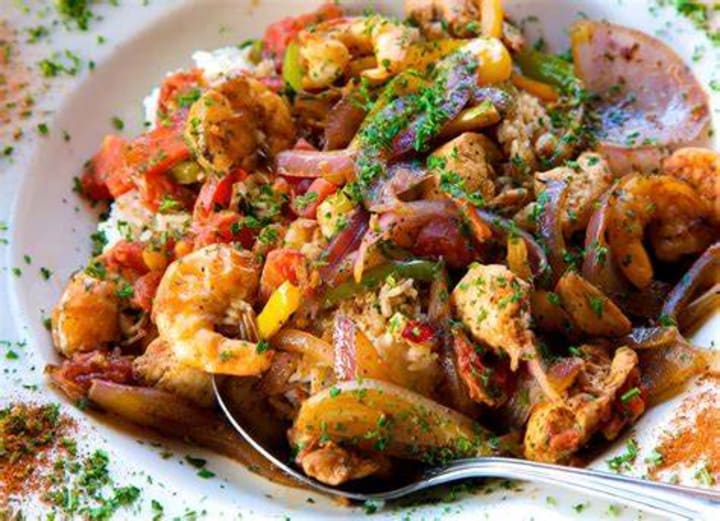 Jambalaya is a popular dish originating from the Cajuns in southern parts of the country. The dish includes rice, shrimp or crab meat, spice, smoked sausage and smoked ham, diced green peppers, garlic, celery, onions, tomatoes, and thyme and bay leaves.