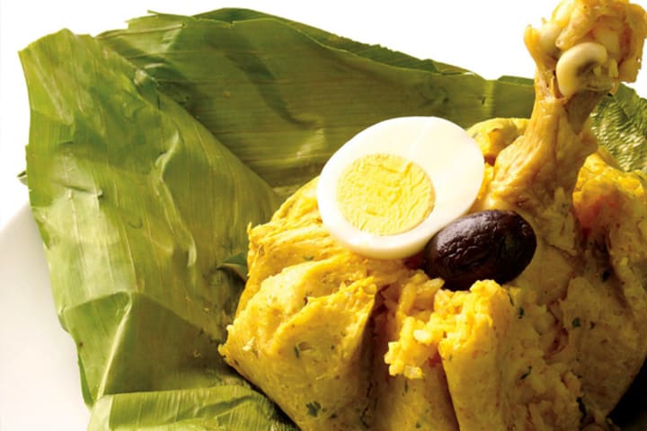 Juane is a traditional dish that originated in the Peruvian jungles. The dish is made with chicken, olives, hard-boiled eggs, and rice seasoned with spices like turmeric, oregano, and cumin. The ingredients are combined, wrapped in waxy bijao leaves, and cooked.