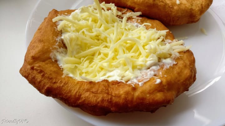 Langos is a Hungarian specialty prepared with dough made of water, flour, yeast, sugar, and salt, then deep-fried to a golden brown. In place of water to make the dough, sour cream, milk, or yogurt can be used. These are eaten as warm snacks, plain or topped with ingredients like sour cream, grated cheese, and garlic sauce.