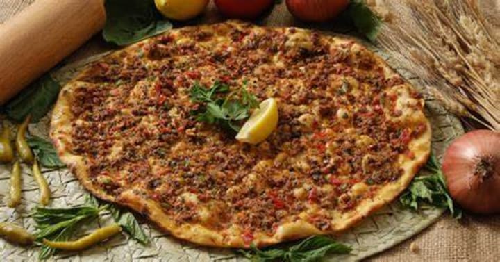 Iahmacum is also called Turkish pizza. It is prepared by rolling a ball of semolina dough into a thin disc and topped with lamb or beef mince together with chili, onions, and other seasonings. It can be found at many street stalls.