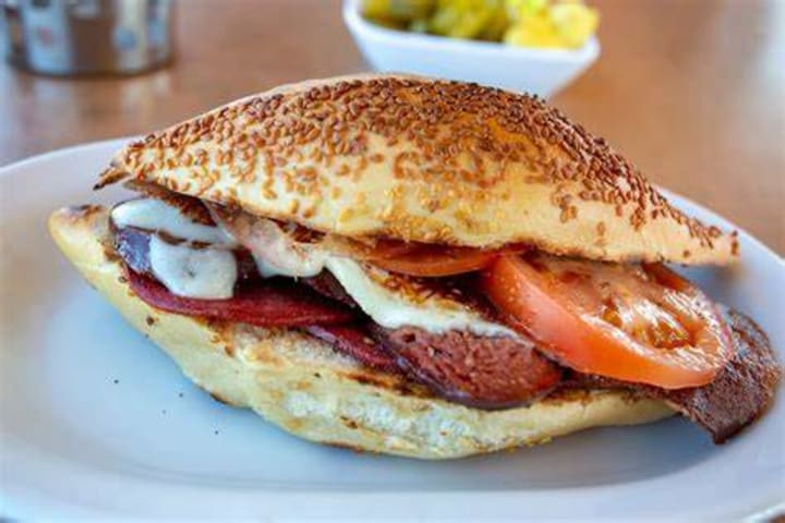 Kumru is a toasted sandwich made with artisanal bread enriched with chickpea flour. The sandwich is filled with kasar cheese, spicy sujuk sausage, and tomatoes. It can include pickles, red pepper flakes, other types of cured meat, or mayonnaise or ketchup.