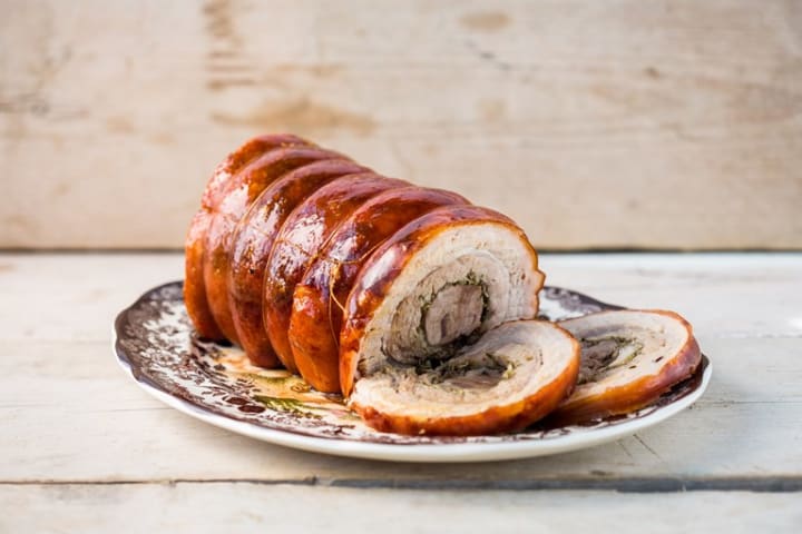 Porchetta is a boneless pork roast made from a piglet or fully grown pig. It is flavored with salt, rosemary, and fennel seeds. The stuffing included liver, fat, or pieces of skin and meat. The meat is rolled up, spitted, and slowly roasted over a wood fire. When done, it is sliced thinly and served warm or cold with bread.