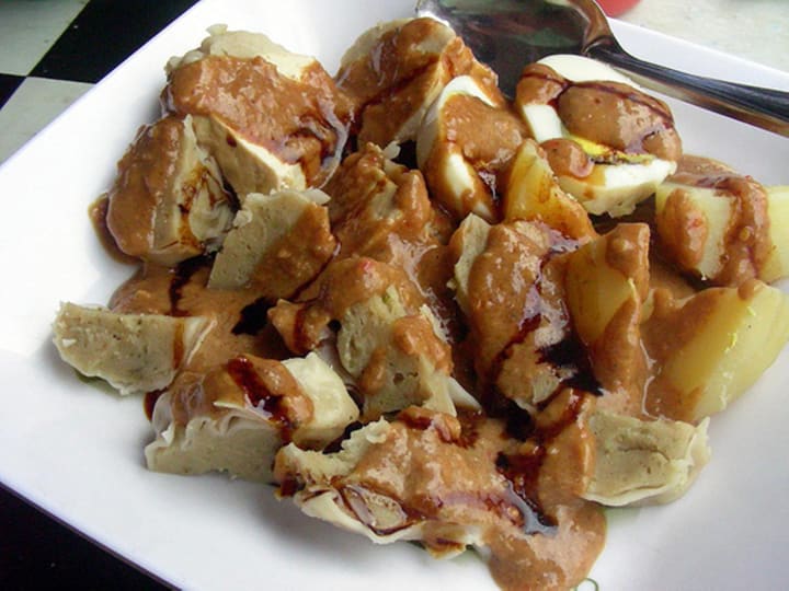 Siomay consists of cone-shaped fish dumplings, eggs, potatoes, cabbage, tofu, and bitter melon. The ingredients are steamed and placed on a plate, cut into bite-sized pieces, and drizzled with spicy peanut sauce.
