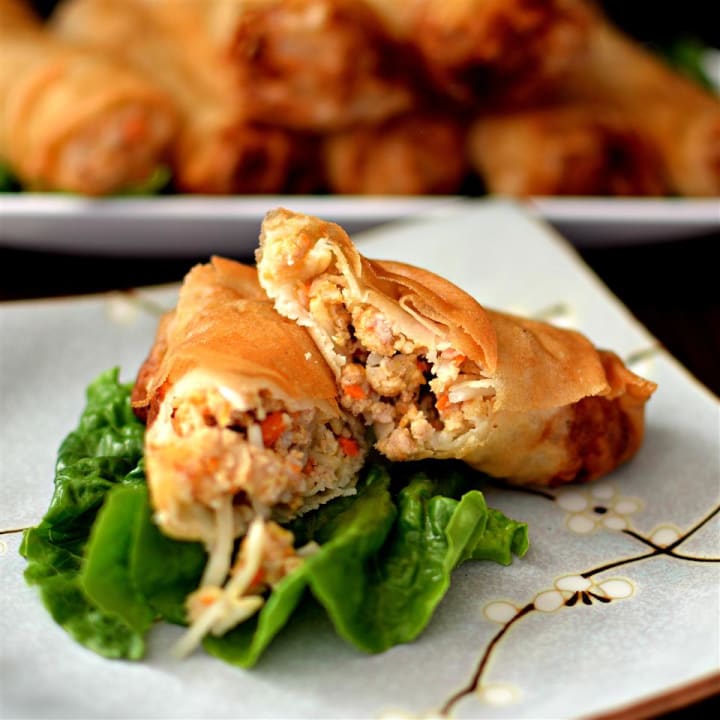 Cha gio in south Vietnam, and nem ran in northern Vietnam. These are spring rolls prepared with a pork and shrimp filling and wrapped in rice paper. Spring rolls can include carrots, cabbage, or mushrooms. The rolls are fried to a golden color.