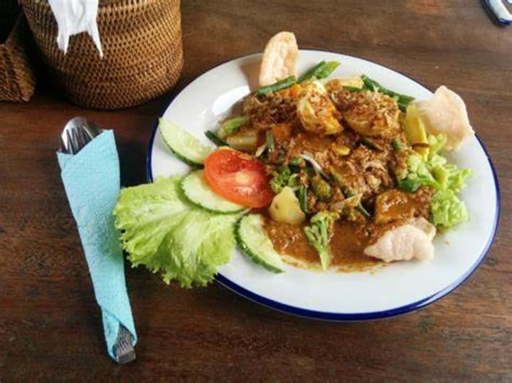 Gado-gado is an Indonesian mixed salad. It consists of different vegetables, eggs, tempeh, and tofu. The vegetables are slightly boiled and tossed with a nutty sauce. Crispy prawn crackers are added. The sauce is traditionally prepared with cashews, but peanuts can be used.