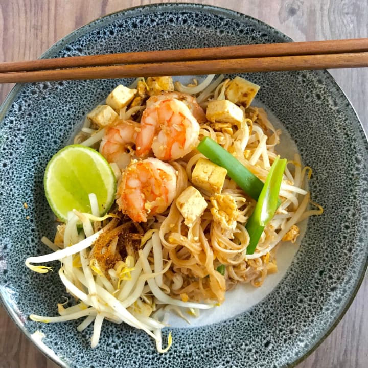 Pad Thai is the national dish of Thailand. This is a stir-fry prepared with rice noodles, tofu, dried shrimp, bean sprouts, and eggs. When meat is used, the popular choices are pork or chicken.