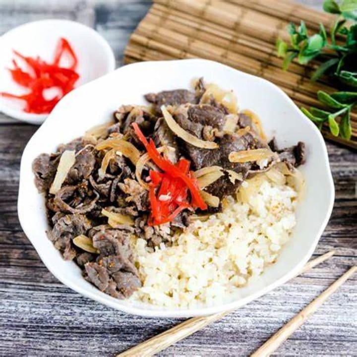 Gyudon is one of the most popular and inexpensive fast food dishes in Japan. Its name translates to beef bowl. It is made with beef and onions cooked with mirin, sugar, sake, and soy sauce and served over a bowl of rice.