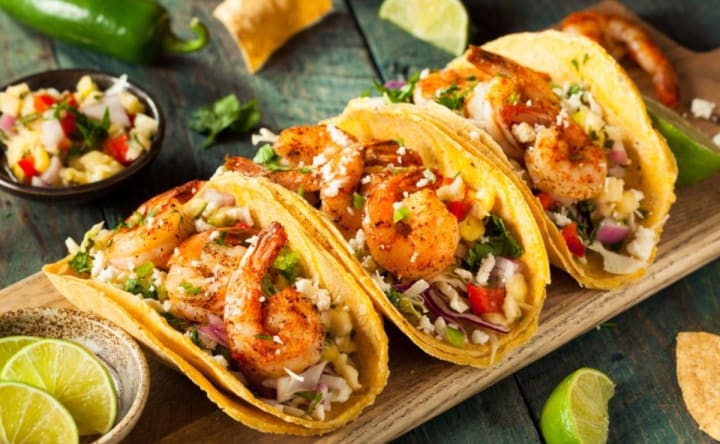 Tacos de camaron is a kind of taco filled with shrimp, tomatoes, onions, coriander, mayonnaise, and pico de gallo. These are served with lime or lemon wedges on the side.