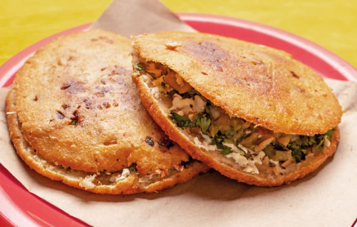 Gorditas are thick tortillas made with masa corn flour. They’re stuffed with ingredients like meat, cheese, beans, nopal cactus, and salsa or guacamole.