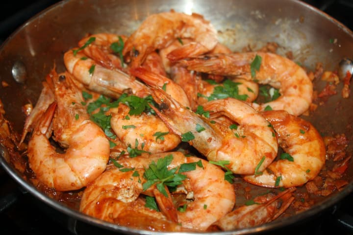 Peppered shrimp is popular street food with shrimp that have a spicy flavor. They are cooked in a skillet with garlic, hot pepper, butter, and thyme.