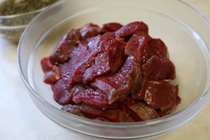 Dice the venison tenderloin or backstrap into bite-sized pieces and place it into a bowl.