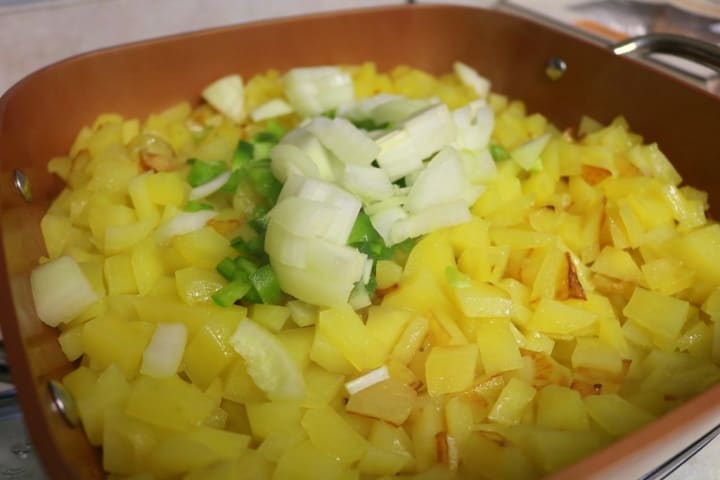 In a frying pan, set to medium-high heat, add a tablespoon of vegetable oil, and add the potatoes. Once the potatoes are more than halfway done, add peppers and onions and continue cooking until done.