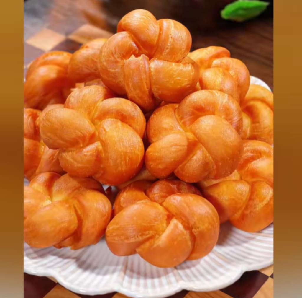 How to Make Them: Mix 500g flour, 140g milk, 3 eggs, 3g salt, 10g sugar, and a packet of yeast. Add 30g oil and knead into a dough. Roll into a log and divide into small portions. Rest for exactly 15 minutes, then roll each piece into a thin rope. Form into flower shapes by looping and twisting. Let rise until doubled in size. Fry at 120°C (250°F) over low heat until golden on both sides. These are pillowy, slightly sweet, and absolutely gorgeous.