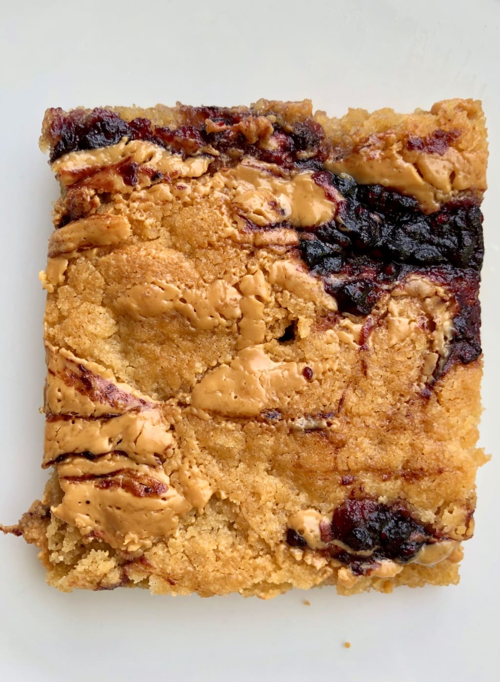 Anyway, fast forward to 2020. These blondies are reminiscent of childhood. I love this recipe because everyone can enjoy them. Adults, kids, teenagers, will all go crazy over these. They're also SO easy and fun to make. Let the kids have fun dolloping and swirling around the jelly into the peanut butter, making all sorts of designs. Or, take turns with friends. Heck, even I, a 27 year old, had fun making these.