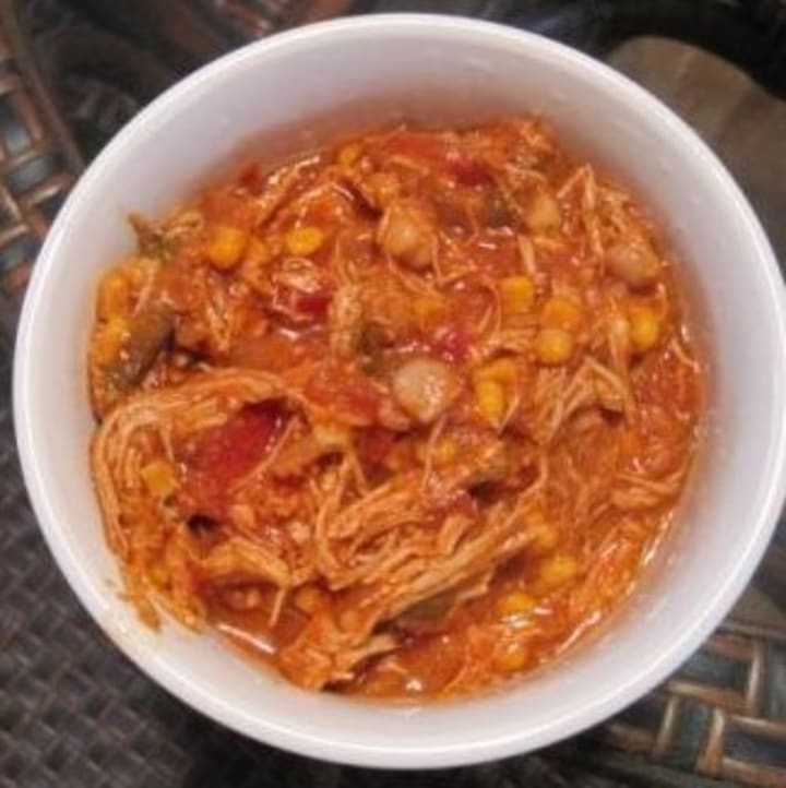 Put all the ingredients in a large crock-pot and stir together. Cook on low for 6-8 hours, until the chicken is “fall apart” tender.