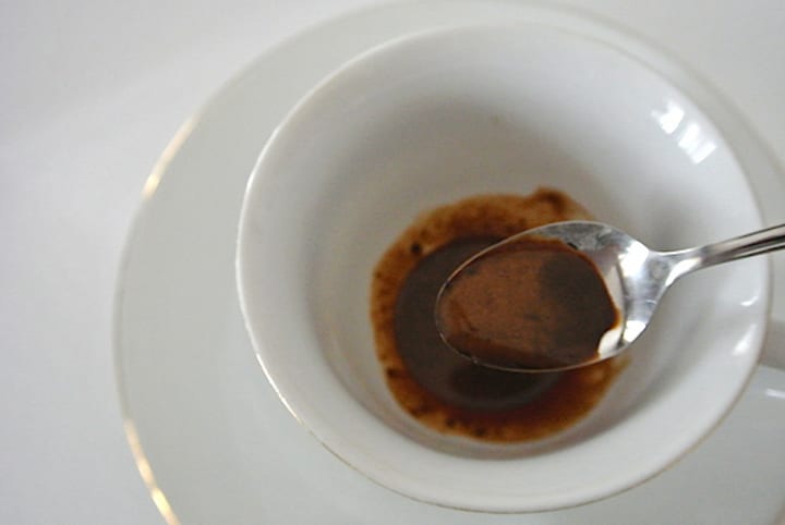 In the first step, all you do is grab your cup and put some coffee and sugar inside. I usually use Nescafe Rich Instant Coffee and put about two and a half tablespoons of that. Then I put three tablespoons of white sugar on top. Obviously, you can put more or less depending on your preferred tastes.
