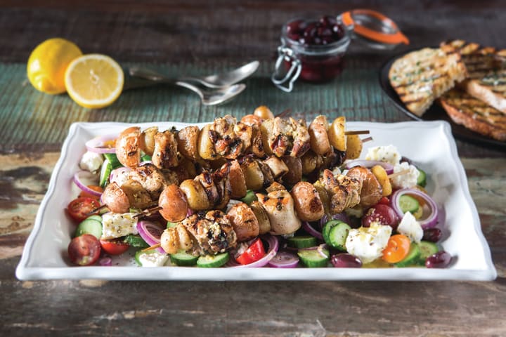 Make summer grilling easy and delicious by cooking your side dish and main dish together so you can spend more time outdoors and less time meal planning. These Grilled Greek Kebabs pair cubed chicken thighs with little potatoes on skewers, making for a classic cookout combo.