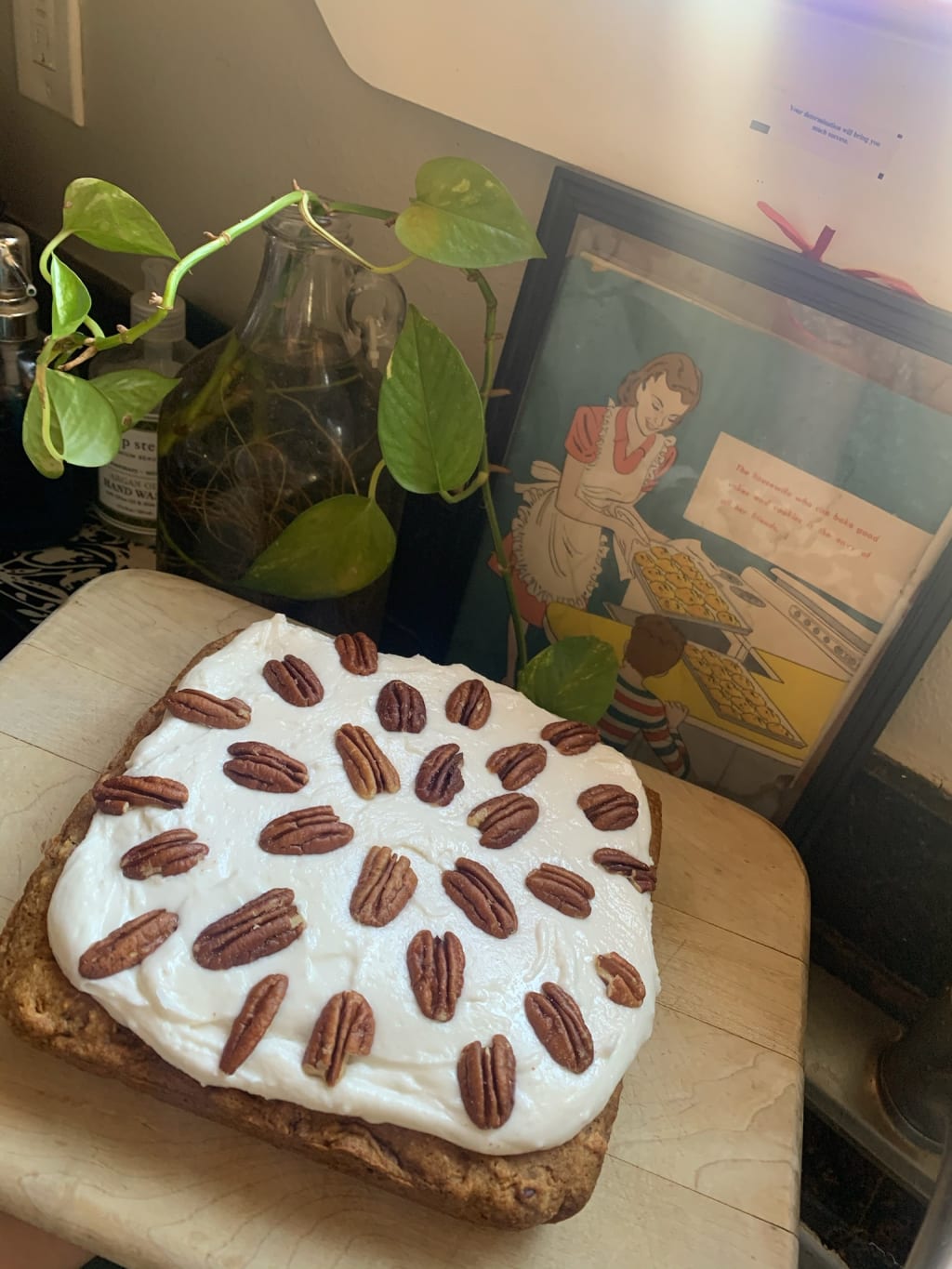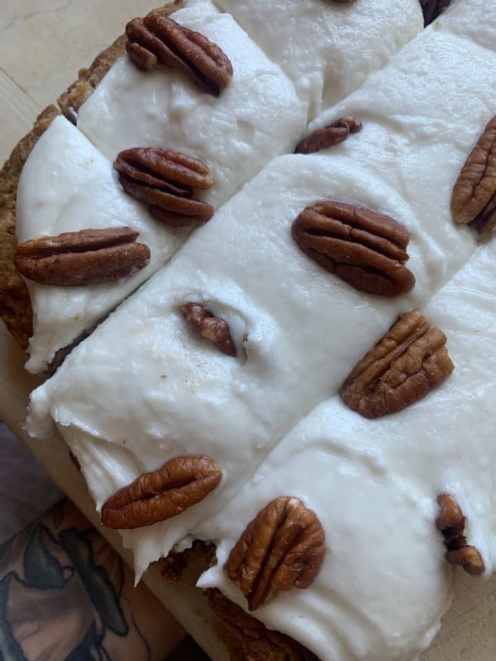 - Use your frosting immediately and spread over the cake evenly. You can choose to garnish with chopped pecans (this is what we did) or toasted coconut slices. Personally, next time I'll be using both because why not?