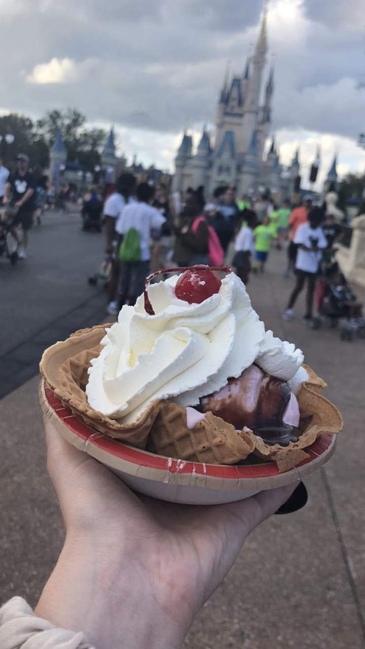 So ice cream seems to be a recurring desert these days, but hey- why not? Vacation calories don’t count right? This one is super simple and can be tried at the Plaza Ice Cream Parlor on Main Street USA. It gives you two scoops of your choice of ice cream, with hot fudge, whipped cream, and a cherry all in a waffle cone bowl. Plus- it has one of the best views on property! Don’t like sundaes? They also have floats and regular cones, which are highly recommended anyways.