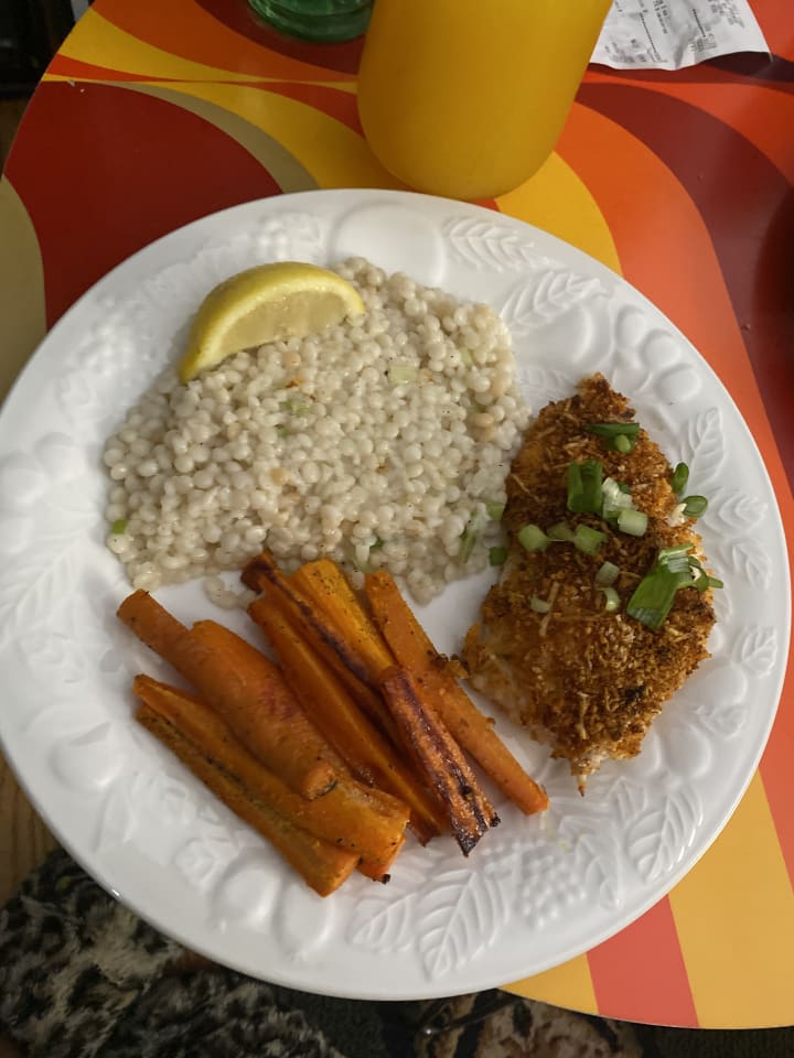 - Crispy parmesan chicken with garlic scallion couscous and lemony roasted carrots.