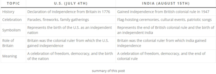 Independence Day, whether it's on July 4th in the U.S. or August 15th in India, is a celebration of freedom, democracy, and the undying spirit of a nation. It's a day to reflect on our history, honor those who fought for our freedoms, and celebrate the values we hold dear. Let's remember to cherish these values, not just on Independence Day, but every day of our lives. The story of our independence is a testament to the fact that freedom is not free - it's earned through resilience, struggle, and an unwavering belief in the ideals of liberty and justice.