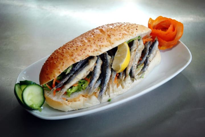 Balık (fish), Ekmek (bread), as the name implies it is the bread sandwiched fish. When you pass by the Galata Bridge, have you found a lot of uncles and men on the bridge with a bucket and a rod fishing, the bridge is full of fish smell. That's right, most of what they catch is this kind of fish in the bread - mackerel.
